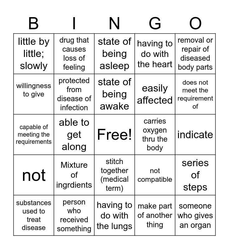 This bingo card has a free space and 24 words: Mixture of ingrdients, person who received something, state of being awake, substances used to treat disease, removal or repair of diseased body parts, little by little; slowly, willingness to give, drug that causes loss of feeling, carries oxygen thru the body, stitch together (medical term), easily affected, capable of meeting the requirements, not compatible, series of steps, protected from disease of infection, make part of another thing, indicate, state of being asleep, does not meet the requirement of, able to get along, someone who gives an organ, not, having to do with the heart and having to do with the lungs.