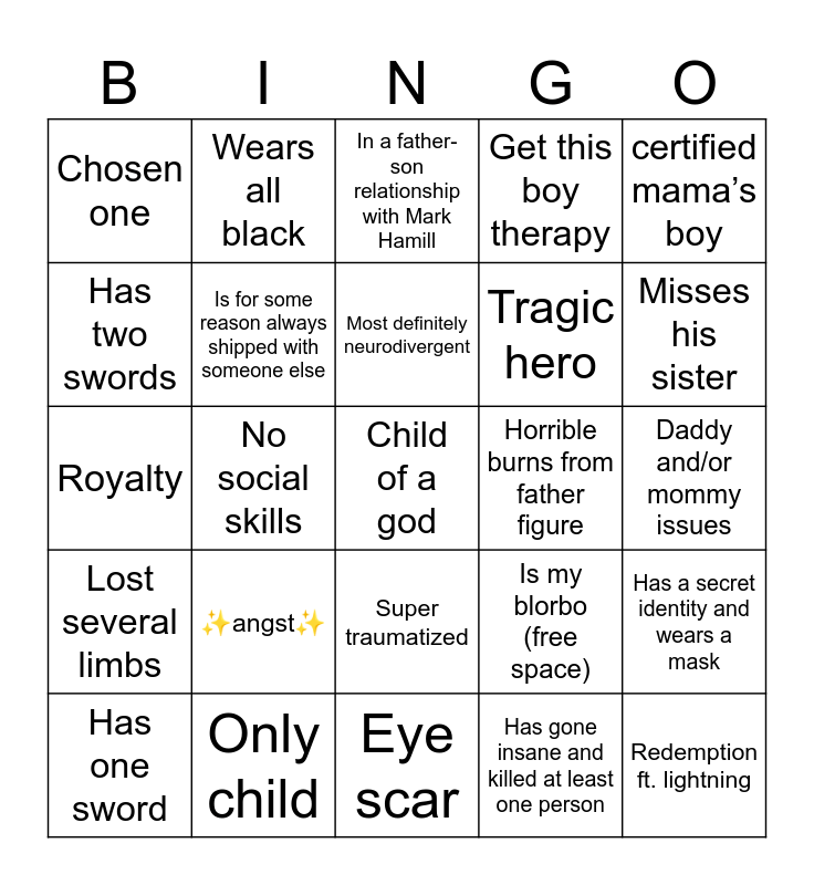 This bingo card has 25 words: ✨angst✨, Eye scar, Most definitely neurodivergent, Has one sword, certified mama’s boy, Chosen one, Has two swords, Wears all black, Horrible burns from father figure, Super traumatized, Tragic hero, Royalty, Is my blorbo (free space), Has a secret identity and wears a mask, Is for some reason always shipped with someone else, Redemption ft. lightning, Daddy and/or mommy issues, In a father-son relationship with Mark Hamill, Misses his sister, No social skills, Child of a god, Only child, Lost several limbs, Get this boy therapy and Has gone insane and killed at least one person.