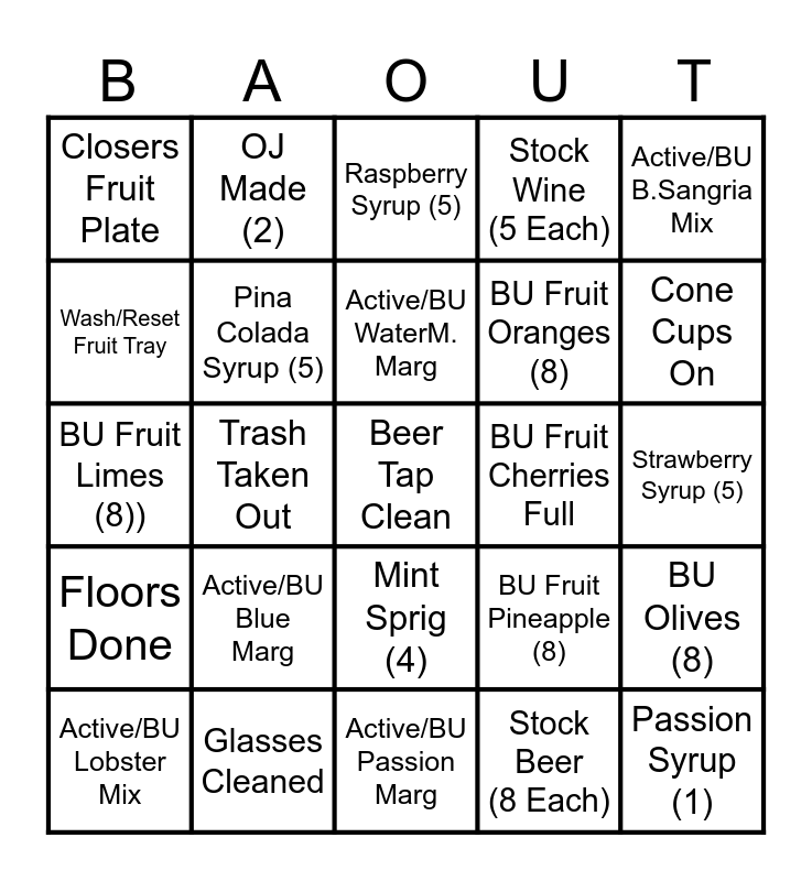 This bingo card has 25 words: Active/BU Blue Marg, Active/BU Passion Marg, Active/BU WaterM. Marg, Active/BU Lobster Mix, Active/BU B.Sangria Mix, Closers Fruit Plate, Wash/Reset Fruit Tray, OJ Made (2), BU Fruit Cherries Full, Mint Sprig (4), BU Fruit Oranges (8), BU Fruit Limes (8)), BU Fruit Pineapple (8), BU Olives (8), Pina Colada Syrup (5), Passion Syrup (1), Strawberry Syrup (5), Raspberry Syrup (5), Cone Cups On, Trash Taken Out, Beer Tap Clean, Glasses Cleaned, Floors Done, Stock Wine (5 Each) and Stock Beer (8 Each).