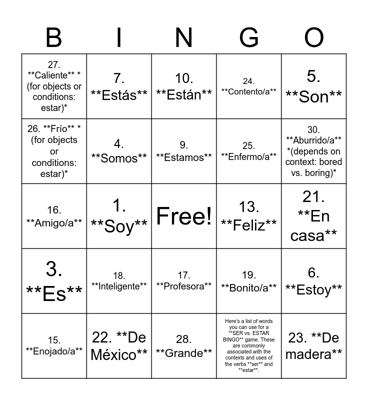 This bingo card has a free space and 32 words: Here’s a list of words you can use for a **SER vs. ESTAR BINGO** game. These are commonly associated with the contexts and uses of the verbs **ser** and **estar**., ### BINGO Word List for SER and ESTAR:, 1. **Soy**, 2. **Eres**, 3. **Es**, 4. **Somos**, 5. **Son**, 6. **Estoy**, 7. **Estás**, 8. **Está**, 9. **Estamos**, 10. **Están**, 11. **Doctor** *(mnemonic for SER: Description, Occupation, Characteristic, Time, Origin, Relationship)*, 12. **Place** *(mnemonic for ESTAR: Position, Location, Action, Condition, Emotion)*, 13. **Feliz**, 14. **Cansado/a**, 15. **Enojado/a**, 16. **Amigo/a**, 17. **Profesora**, 18. **Inteligente**, 19. **Bonito/a**, 20. **En la clase**, 21. **En casa**, 22. **De México**, 23. **De madera**, 24. **Contento/a**, 25. **Enfermo/a**, 26. **Frío** *(for objects or conditions: estar)*, 27. **Caliente** *(for objects or conditions: estar)*, 28. **Grande**, 29. **Pequeño/a** and 30. **Aburrido/a** *(depends on context: bored vs. boring)*.