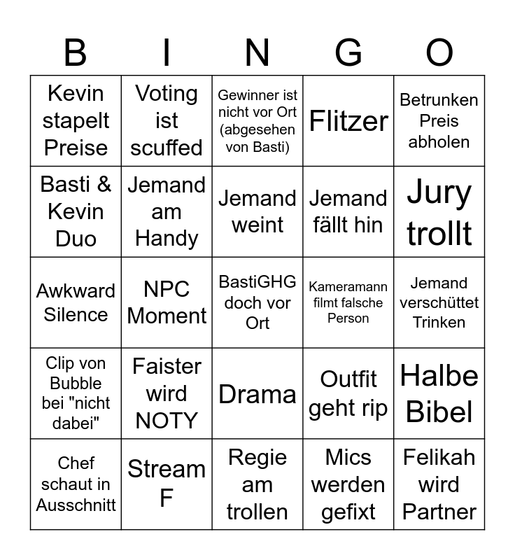 This bingo card has 25 words: Faister wird NOTY, Regie am trollen, Jemand weint, Chef schaut in Ausschnitt, Betrunken Preis abholen, Kevin stapelt Preise, Basti & Kevin Duo, Voting ist scuffed, Kameramann filmt falsche Person, Drama, Jemand fällt hin, Awkward Silence, Outfit geht rip, Halbe Bibel, Jemand am Handy, Felikah wird Partner, Jemand verschüttet Trinken, Gewinner ist nicht vor Ort (abgesehen von Basti), Jury trollt, NPC Moment, BastiGHG doch vor Ort, Stream F, Clip von Bubble bei "nicht dabei", Flitzer and Mics werden gefixt.
