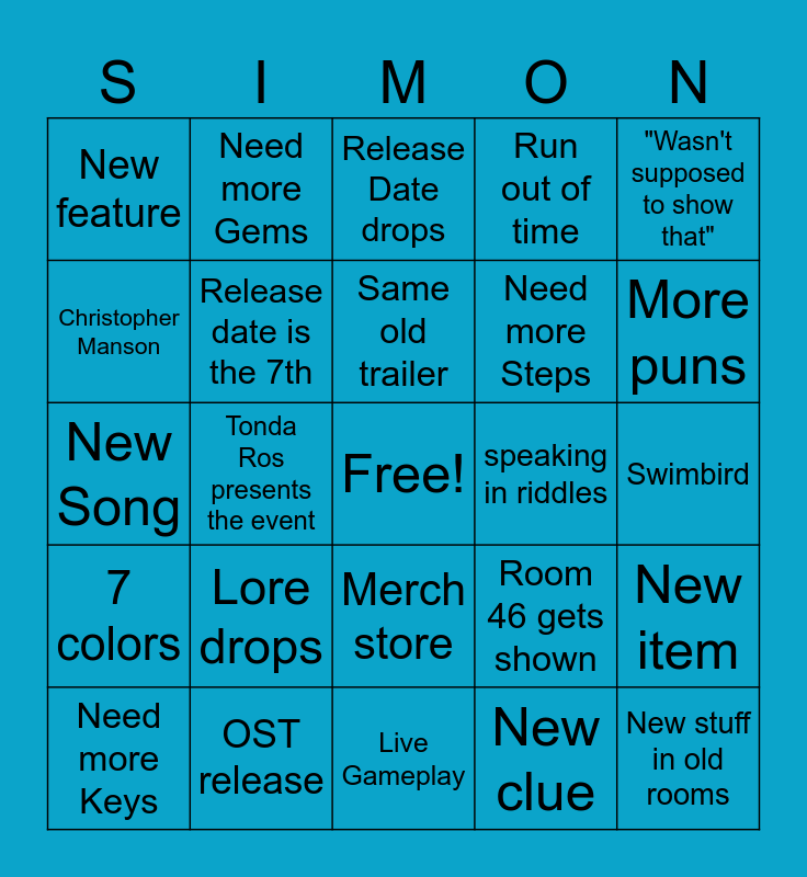 This bingo card has a free space and 31 words: Live Gameplay, More then 4 days, Tonda Ros presents the event, New Rooms, New feature, Release Date drops, Release date is the 7th, Room 46 gets shown, speaking in riddles, New clue, Swimbird, New stuff in old rooms, Talking about development, Community theories mentioned, More puns, Painting pairs, New item, Lore drops, 7 colors, Merch store, "Wasn't supposed to show that", Run ends in dead-ends, Need more Keys, Need more Gems, Need more Steps, Christopher Manson, Run out of time, New Song, OST release, Same old trailer and The same demo gameplay.