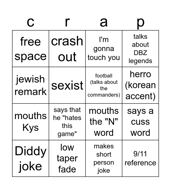 This bingo card has 16 words: Diddy joke, low taper fade, I'm gonna touch you, talks about DBZ legends, jewish remark, crash out, mouths the "N" word, says a cuss word, free space, sexist, makes short person joke, herro (korean accent), mouths Kys, says that he "hates this game", football (talks about the commanders) and 9/11 reference.
