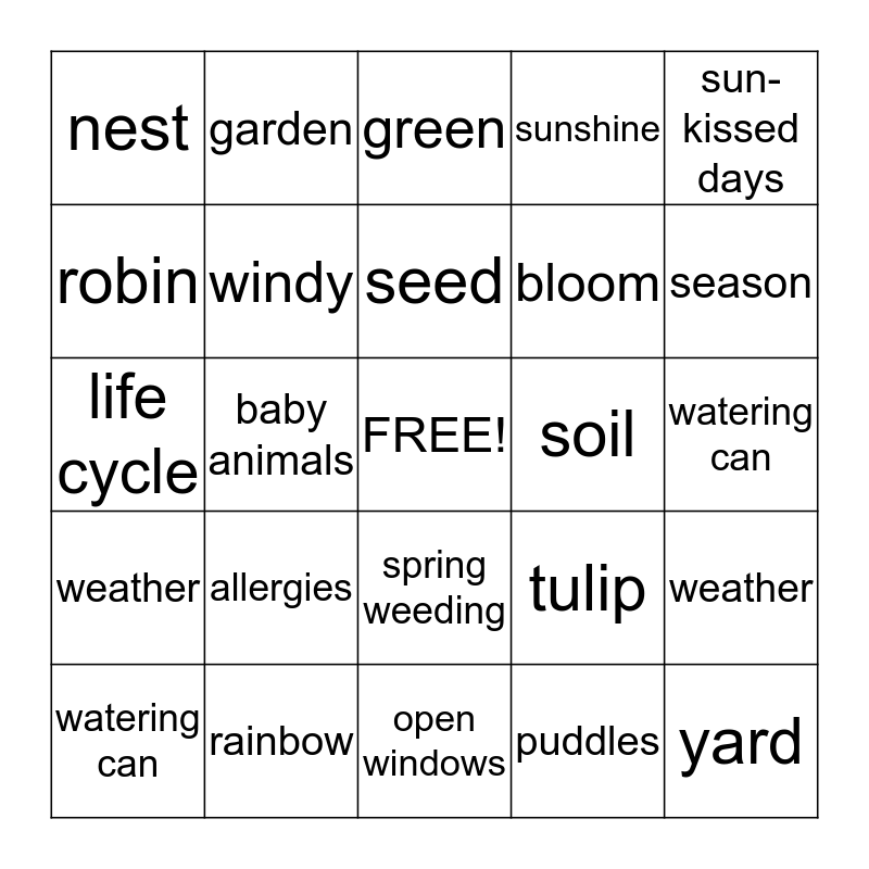 This bingo card has a free space and 24 words: allergies, rainbow, seed, watering can, sun-kissed days, nest, robin, garden, soil, spring weeding, bloom, life cycle, tulip, weather, windy, puddles, watering can, green, season, baby animals, yard, weather, sunshine and open windows.