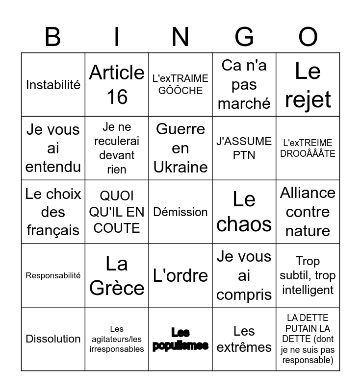 This bingo card has a free space and 24 words: La Grèce, Les agitateurs/les irresponsables, Guerre en Ukraine, Dissolution, Le rejet, Instabilité, Je vous ai entendu, Article 16, Le chaos, L'ordre, J'ASSUME PTN, Le choix des français, Je vous ai compris, Trop subtil, trop intelligent, Je ne reculerai devant rien, Les extrêmes, Alliance contre nature, L'exTRAIME GÔÔCHE, L'exTREIME DROOÂÂÂTE, QUOI QU'IL EN COUTE, LA DETTE PUTAIN LA DETTE (dont je ne suis pas responsable), Responsabilité, Ca n'a pas marché and Les populismes.