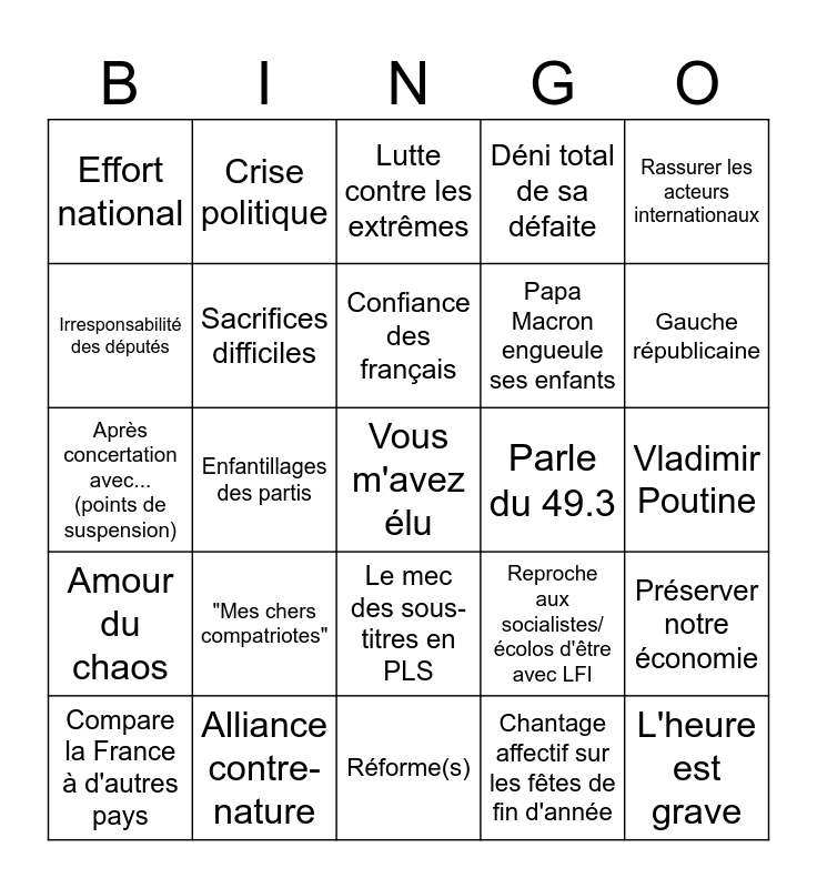This bingo card has 25 words: "Mes chers compatriotes", Réforme(s), Confiance des français, Compare la France à d'autres pays, Rassurer les acteurs internationaux, Effort national, Irresponsabilité des députés, Crise politique, Parle du 49.3, Le mec des sous-titres en PLS, Papa Macron engueule ses enfants, Après concertation avec... (points de suspension), Reproche aux socialistes/écolos d'être avec LFI, Préserver notre économie, Sacrifices difficiles, L'heure est grave, Vladimir Poutine, Lutte contre les extrêmes, Gauche républicaine, Enfantillages des partis, Vous m'avez élu, Alliance contre-nature, Amour du chaos, Déni total de sa défaite and Chantage affectif sur les fêtes de fin d'année.