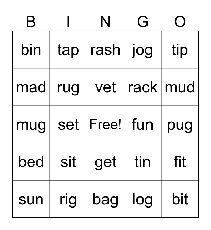 This bingo card has a free space and 24 words: sit, rig, vet, sun, tip, bin, mad, tap, fun, get, rack, mug, tin, fit, rug, log, pug, rash, mud, set, bit, bed, jog and bag.