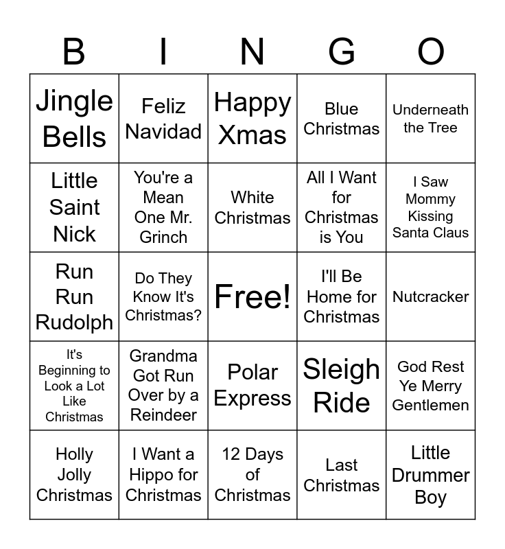 This bingo card has a free space and 34 words: Rudolph, Last Christmas, Rockin' Around the Christmas Tree, Jingle Bell Rock, It's Beginning to Look a Lot Like Christmas, You're a Mean One Mr. Grinch, Underneath the Tree, Holly Jolly Christmas, Feliz Navidad, Mele Kalikimaka, White Christmas, Happy Xmas, Santa Tell Me, Deck the Halls, I'll Be Home for Christmas, I Saw Mommy Kissing Santa Claus, I Want a Hippo for Christmas, Run Run Rudolph, Grandma Got Run Over by a Reindeer, Sleigh Ride, Polar Express, It's the Most Wonderful Time of the Year, Jingle Bells, Nutcracker, 12 Days of Christmas, Little Drummer Boy, Blue Christmas, Let it Snow, All I Want for Christmas is You, Little Saint Nick, Christmas Tree Farm, Do They Know It's Christmas?, God Rest Ye Merry Gentlemen and Carol of the Bells.