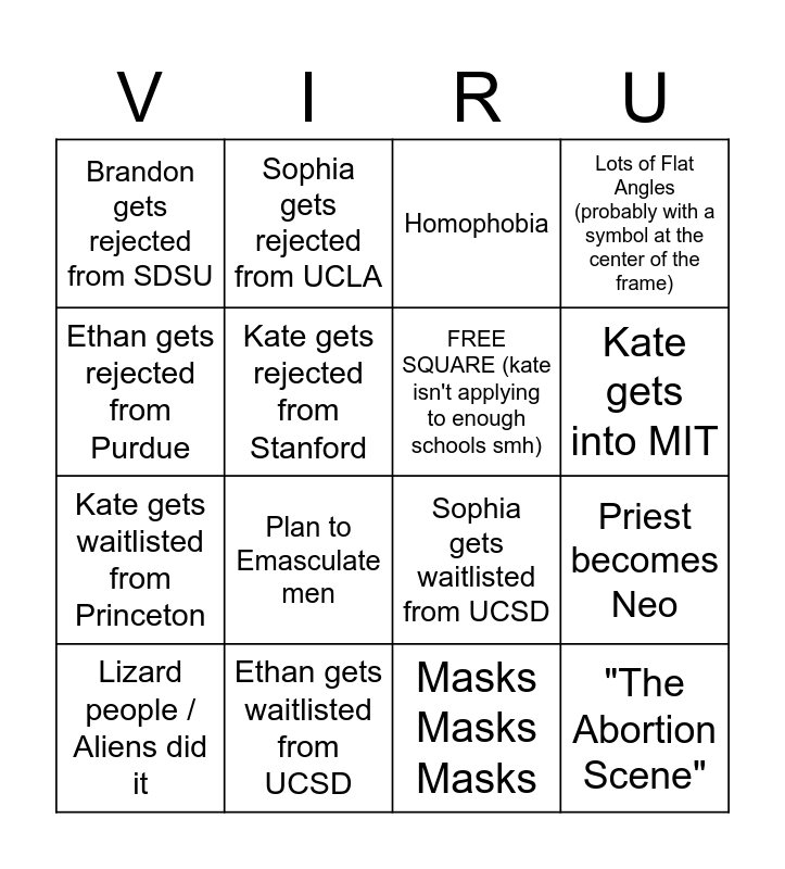 This bingo card has 25 words: Ethan gets into Cornell, Brandon gets into USC, Kate gets into MIT, Sophia gets into Yale, Ethan gets rejected from Purdue, Brandon gets rejected from SDSU, Kate gets rejected from Stanford, Sophia gets rejected from UCLA, Ethan gets waitlisted from UCSD, Brandon gets waitlisted from UCLA, Kate gets waitlisted from Princeton, Sophia gets waitlisted from UCSD, Ethan gets deferred from Northeastern, Brandon gets rejected from John Hopkins, FREE SQUARE (kate isn't applying to enough schools smh), Sophia gets deferred from Tech, Masks Masks Masks, Homophobia, Plan to Emasculate men, Priest becomes Neo, Lizard people / Aliens did it, Christian Holocaust, "The Abortion Scene", Lots of Flat Angles (probably with a symbol at the center of the frame) and Prayer War.