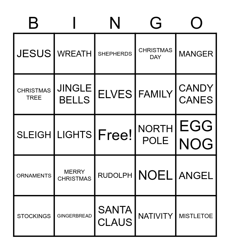 This bingo card has a free space and 25 words: MERRY CHRISTMAS, SANTA CLAUS, ELVES, STOCKINGS, MANGER, JESUS, CHRISTMAS TREE, WREATH, NORTH POLE, RUDOLPH, FAMILY, SLEIGH, NOEL, ANGEL, JINGLE BELLS, SILENT NIGHT, EGG NOG, SHEPHERDS, CANDY CANES, LIGHTS, MISTLETOE, GINGERBREAD, ORNAMENTS, CHRISTMAS DAY and NATIVITY.