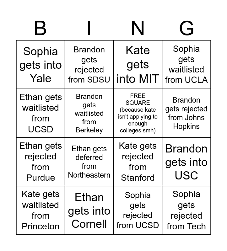 This bingo card has 16 words: Ethan gets into Cornell, Brandon gets into USC, Kate gets into MIT, Sophia gets into Yale, Ethan gets rejected from Purdue, Brandon gets rejected from SDSU, Kate gets rejected from Stanford, Sophia gets rejected from UCSD, Ethan gets waitlisted from UCSD, Brandon gets waitlisted from Berkeley, Kate gets waitlisted from Princeton, Sophia gets waitlisted from UCLA, Ethan gets deferred from Northeastern, Brandon gets rejected from Johns Hopkins, FREE SQUARE (because kate isn't applying to enough colleges smh) and Sophia gets rejected from Tech.