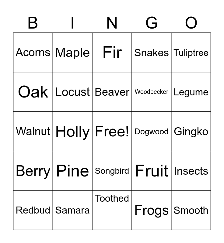 This bingo card has a free space and 24 words: Pine, Samara, Beaver, Redbud, Tuliptree, Acorns, Oak, Maple, Dogwood, Songbird, Woodpecker, Walnut, Fruit, Insects, Locust, Frogs, Gingko, Fir, Legume, Holly, Smooth, Berry, Snakes and Toothed.