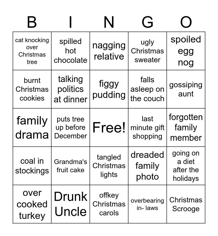 This bingo card has a free space and 24 words: Grandma's fruit cake, Drunk Uncle, figgy pudding, over cooked turkey, spoiled egg nog, cat knocking over Christmas tree, burnt Christmas cookies, spilled hot chocolate, last minute gift shopping, tangled Christmas lights, falls asleep on the couch, family drama, dreaded family photo, going on a diet after the holidays, talking politics at dinner, overbearing in- laws, forgotten family member, nagging relative, gossiping aunt, puts tree up before December, Christmas Scrooge, coal in stockings, ugly Christmas sweater and offkey Christmas carols.
