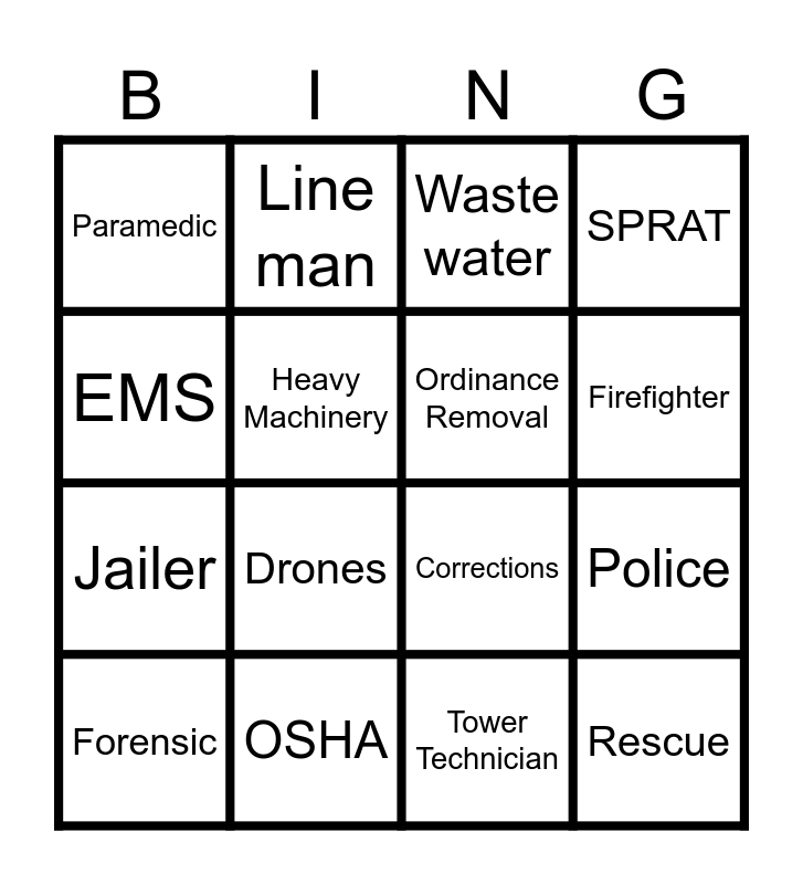 This bingo card has 24 words: CDL, Forklift operator, Firefighter, Water, EMS, Paramedic, Heavy Machinery, Line man, OSHA, Security, Jailer, Corrections, Cyber Security, Dispatch, Ordinance Removal, Construction, Tower Technician, Waste water, Drones, Police, Forensic, Rescue, SPRAT and Hazmat.