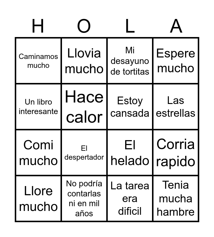 This bingo card has 18 words: El despertador, Tenia mucha hambre, Mi desayuno de tortitas, Caminamos mucho, El helado, Espere mucho, Llore mucho, Llovia mucho, Las estrellas, Comi mucho, La tarea era dificil, Un libro interesante, Corria rapido, Hace calor, Estoy cansada, Me rei tanto, No podría contarlas ni en mil años and Podría alimentar a un ejército.