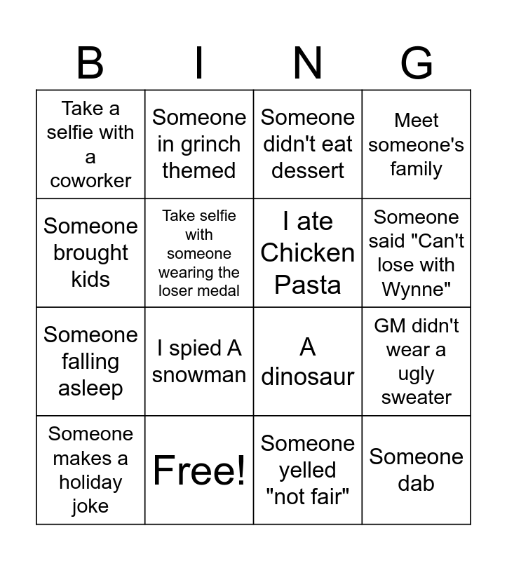 This bingo card has 16 words: Free!, GM didn't wear a ugly sweater, Someone didn't eat dessert, Take a selfie with a coworker, Someone falling asleep, Someone in grinch themed, A dinosaur, Someone yelled "not fair", Someone brought kids, Take selfie with someone wearing the loser medal, Someone makes a holiday joke, Meet someone's family, I spied A snowman, Someone said "Can't lose with Wynne", I ate Chicken Pasta and Someone dab.