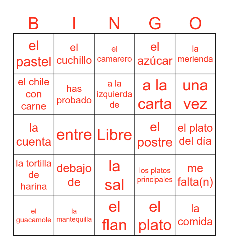 This bingo card has a free space and 54 words: el aguacate, la tortilla de harina, la tortilla de maíz, la salsa, la sal, la pimienta, el azúcar, la carne de res, el chile con carne, el chile relleno, el pastel, el helado, la mantequilla, el guacamole, los frijoles refritos, el flan, la comida, a la carta, la especialidad de la casa, el plato del día, los platos principales, el menú, el postre, la merienda, la cuchara, el cuchillo, el tenedor, la servilleta, el mantel, el plato, el platillo, el vaso, la taza, el tazón, el camarero, la camarera, la cuenta, me falta(n), me trae, has probado, he probado, Se hace(n) con, Algo más, encima de, debajo de, delante de, detrás de, a la derecha de, a la izquierda de, entre, una vez, muchas veces, lo mismo and Aquí está.