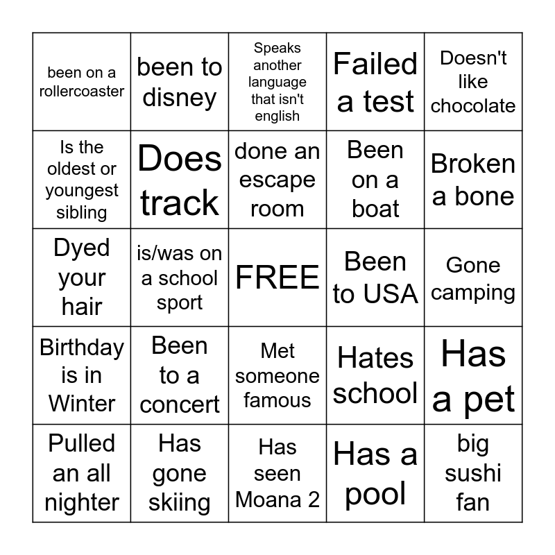 This bingo card has a free space and 24 words: Been to a concert, Has gone skiing, done an escape room, Pulled an all nighter, Doesn't like chocolate, been on a rollercoaster, Is the oldest or youngest sibling, been to disney, Been to USA, Met someone famous, Been on a boat, Dyed your hair, Hates school, Has a pet, Does track, Has a pool, Gone camping, Speaks another language that isn't english, Broken a bone, is/was on a school sport, big sushi fan, Birthday is in Winter, Failed a test and Has seen Moana 2.
