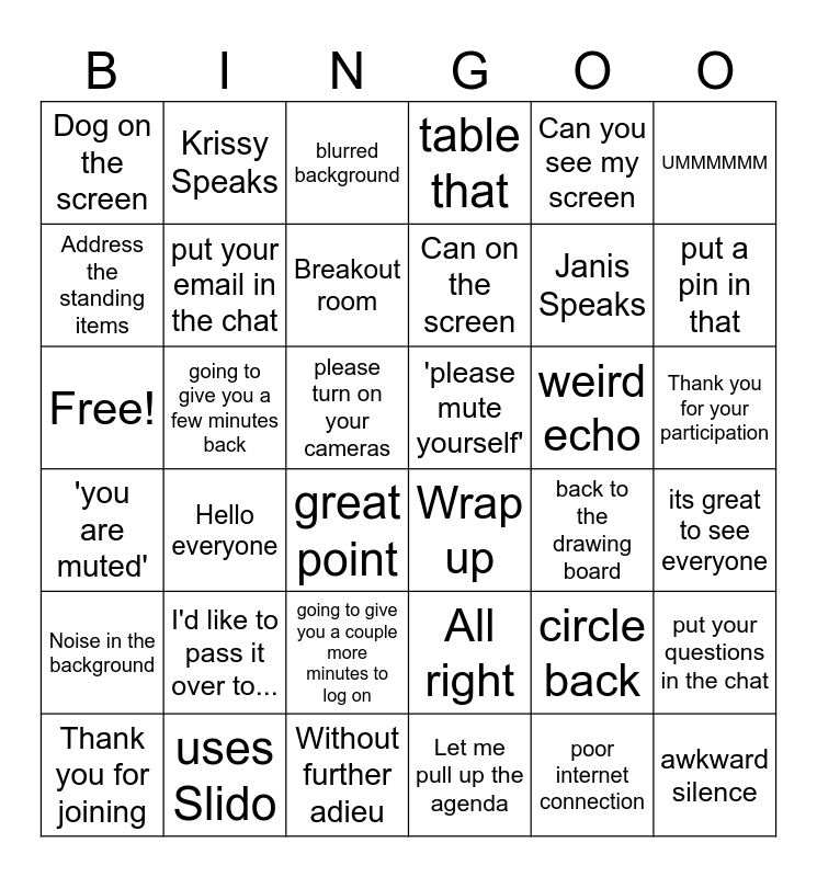 This bingo card has 36 words: All right, going to give you a couple more minutes to log on, Let me pull up the agenda, Address the standing items, 'you are muted', 'please mute yourself', put your email in the chat, Without further adieu, Can you see my screen, circle back, put a pin in that, table that, put your questions in the chat, going to give you a few minutes back, Can on the screen, Dog on the screen, Noise in the background, weird echo, Free!, blurred background, please turn on your cameras, Hello everyone, Wrap up, great point, back to the drawing board, Krissy Speaks, Janis Speaks, uses Slido, Breakout room, UMMMMMM, awkward silence, Thank you for joining, its great to see everyone, Thank you for your participation, I'd like to pass it over to... and poor internet connection.