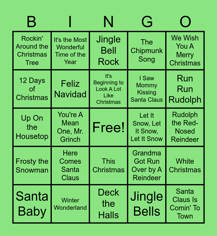 This bingo card has a free space and 29 words: Santa Baby, Silent Night, You're A Mean One, Mr. Grinch, Last Christmas, Rockin' Around the Christmas Tree, Jingle Bell Rock, Feliz Navidad, Here Comes Santa Claus, Let It Snow, Let It Snow, Let It Snow, Winter Wonderland, Rudolph the Red-Nosed Reindeer, Santa Claus Is Comin' To Town, Deck the Halls, Jingle Bells, Run Run Rudolph, I Want A Hippopotamus For Christmas, This Christmas, Frosty the Snowman, We Wish You A Merry Christmas, Up On the Housetop, Grandma Got Run Over by A Reindeer, Mele Kalikimaka, I Saw Mommy Kissing Santa Claus, 12 Days of Christmas, The Chipmunk Song, It's the Most Wonderful Time of the Year, White Christmas, It's Beginning to Look A Lot Like Christmas and Little Saint Nick.
