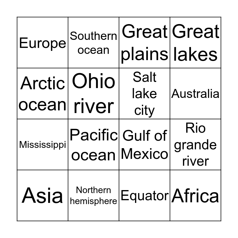 This bingo card has a free space and 15 words: Asia, Africa, Great plains, Europe, Australia, Arctic ocean, Pacific ocean, Equator, Ohio river, Mississippi, Rio grande river, Great lakes, Salt lake city, Southern ocean and Northern hemisphere.
