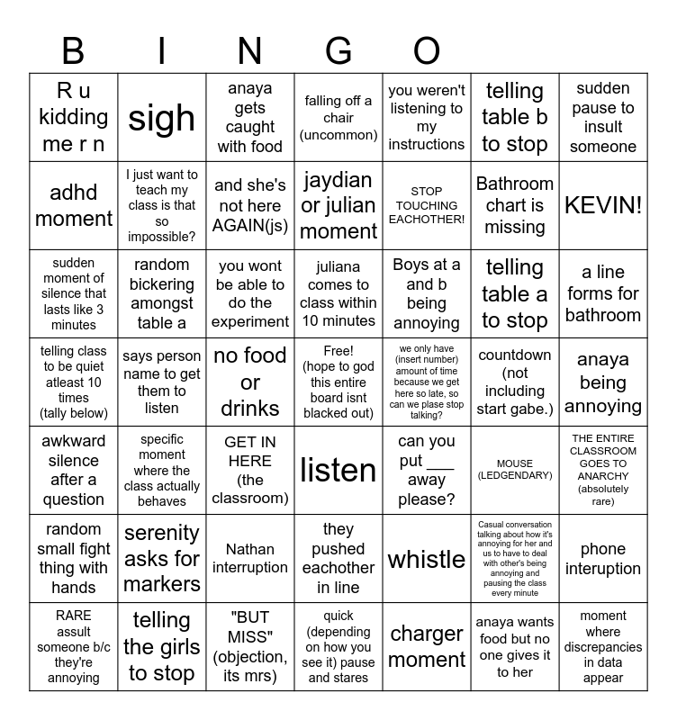 This bingo card has a free space and 48 words: whistle, Bathroom chart is missing, quick (depending on how you see it) pause and stares, says person name to get them to listen, you wont be able to do the experiment, anaya being annoying, sigh, telling the girls to stop, telling table b to stop, listen, sudden pause to insult someone, falling off a chair (uncommon), telling table a to stop, Boys at a and b being annoying, random small fight thing with hands, countdown (not including start gabe.), adhd moment, KEVIN!, Casual conversation talking about how it's annoying for her and us to have to deal with other's being annoying and pausing the class every minute, you weren't listening to my instructions, STOP TOUCHING EACHOTHER!, no food or drinks, R u kidding me r n, I just want to teach my class is that so impossible?, phone interuption, and she's not here AGAIN(js), a line forms for bathroom, RARE assult someone b/c they're annoying, juliana comes to class within 10 minutes, random bickering amongst table a, anaya wants food but no one gives it to her, we only have (insert number) amount of time because we get here so late, so can we plase stop talking?, THE ENTIRE CLASSROOM GOES TO ANARCHY (absolutely rare), serenity asks for markers, telling class to be quiet atleast 10 times (tally below), can you put ___ away please?, MOUSE (LEDGENDARY), sudden moment of silence that lasts like 3 minutes, GET IN HERE (the classroom), Nathan interruption, awkward silence after a question, moment where discrepancies in data appear, anaya gets caught with food, "BUT MISS" (objection, its mrs), jaydian or julian moment, they pushed eachother in line, specific moment where the class actually behaves and charger moment.
