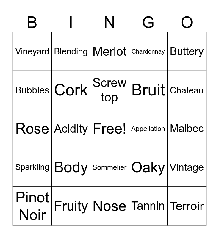 This bingo card has a free space and 28 words: Vintage, Corked, Bruit, Tannin, Bubbles, Merlot, Blending, Sparkling, Appellation, Pinot Noir, Rose, Chardonnay, Fruity, Nose, Chateau, Champagne, Body, Cork, Screw top, Sommelier, Vineyard, Cabernet, Terroir, Acidity, Malbec, Oaky, Buttery and Velvety.