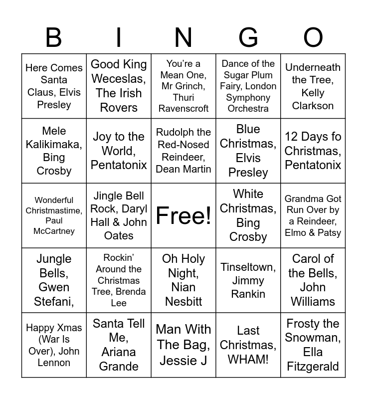 This bingo card has a free space and 40 words: Mistletoe, Justin Beiber, Wonderful Christmastime, Paul McCartney, I Saw Mommy Kissing Santa Claus, The Jacksons, Joy to the World, Pentatonix, Santa Tell Me, Ariana Grande, Oh Holy Night, Nian Nesbitt, Rudolph the Red-Nosed Reindeer, Dean Martin, I Wanna Hippopotamus for Christmas, DDNDY Productions, Underneath the Tree, Kelly Clarkson, Jungle Bells, Gwen Stefani,, Jingle Bell Rock, Daryl Hall & John Oates, Dance of the Sugar Plum Fairy, London Symphony Orchestra, Frosty the Snowman, Ella Fitzgerald, Grandma Got Run Over by a Reindeer, Elmo & Patsy, White Christmas, Bing Crosby, Rockin’ Around the Christmas Tree, Brenda Lee, Feliz Navidad, Jose Feliciano, Here Comes Santa Claus, Elvis Presley, Let It Snow, Let It Snow, Let It Snow, Michael Buble, You’re a Mean One, Mr Grinch, Thuri Ravenscroft, Carol of the Bells, John Williams, Last Christmas, WHAM!, Blue Christmas, Elvis Presley, Mele Kalikimaka, Bing Crosby, Little Drummer Boy, Pentatonix, White Winter Hymnal, Pentatonix, This Christmas, John Legend, Here We Come a-Caroling/We Wish You a Merry Christmas, Perry Como, A Marshmallow World, Dean Martin, Christmas Lights, Coldplay, Deck the Halls, Pentatonix, Happy Xmas (War Is Over), John Lennon, I’ll Be Home for Christmas, Racal Flats, Tinseltown, Jimmy Rankin, 12 Days fo Christmas, Pentatonix, Man With The Bag, Jessie J, Christmas Tree Farm, Taylor Swift, What Child is This/The Holly and the Ivy Medley, Bing Crosby, Good King Weceslas, The Irish Rovers and The First Noel, Lady A.
