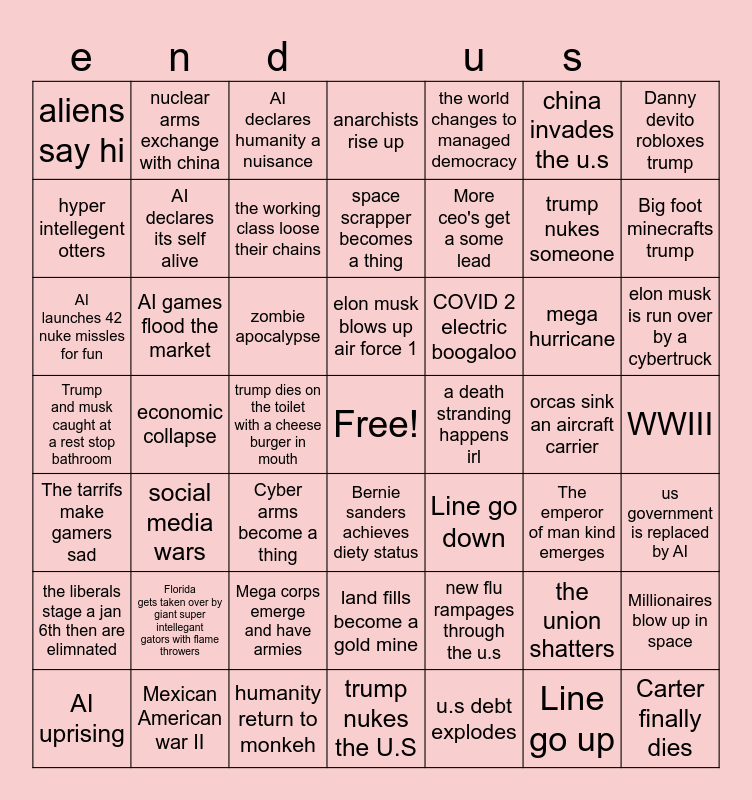 This bingo card has a free space and 48 words: new flu rampages through the u.s, trump nukes someone, trump nukes the U.S, economic collapse, zombie apocalypse, WWIII, nuclear arms exchange with china, Mexican American war II, china invades the u.s, Bernie sanders achieves diety status, Danny devito robloxes trump, anarchists rise up, mega hurricane, COVID 2 electric boogaloo, the liberals stage a jan 6th then are elimnated, orcas sink an aircraft carrier, hyper intellegent otters, Big foot minecrafts trump, the union shatters, the world changes to managed democracy, More ceo's get a some lead, trump dies on the toilet with a cheese burger in mouth, aliens say hi, AI declares its self alive, Millionaires blow up in space, the working class loose their chains, elon musk is run over by a cybertruck, AI uprising, elon musk blows up air force 1, AI games flood the market, Line go up, a death stranding happens irl, us government is replaced by AI, Florida gets taken over by giant super intellegant gators with flame throwers, Trump and musk caught at a rest stop bathroom, Line go down, The emperor of man kind emerges, AI launches 42 nuke missles for fun, Cyber arms become a thing, Mega corps emerge and have armies, The tarrifs make gamers sad, Carter finally dies, AI declares humanity a nuisance, humanity return to monkeh, space scrapper becomes a thing, land fills become a gold mine, social media wars and u.s debt explodes.