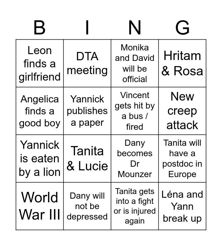 This bingo card has 16 words: Dany will not be depressed, Tanita will have a postdoc in Europe, Monika and David will be official, Leon finds a girlfriend, Yannick is eaten by a lion, DTA meeting, Dany becomes Dr Mounzer, Tanita gets into a fight or is injured again, Angelica finds a good boy, Yannick publishes a paper, World War III, Hritam & Rosa, Tanita & Lucie, New creep attack, Vincent gets hit by a bus / fired and Léna and Yann break up.