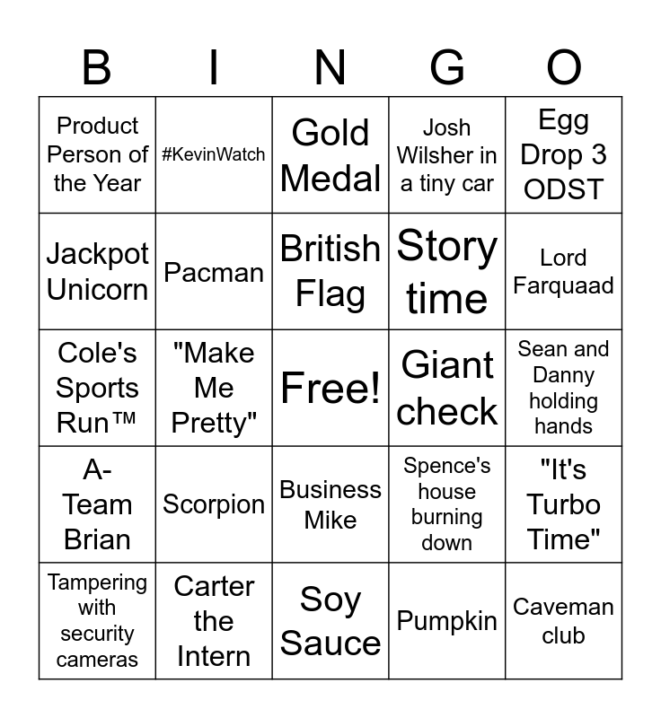 This bingo card has a free space and 42 words: Pickle Dillon, British Flag, Small child, Scorpion, Pumpkin, "It's Turbo Time", Caveman club, Spuncethespud.com, Gold Medal, Business Mike, Sean and Danny holding hands, Lord Farquaad, "Make Me Pretty", Egg Drop 3 ODST, Poker Chips, Spence's house burning down, Real Slim Cameron, Cole's Sports Run™️, Fridge Bylaws, #KevinWatch, Jackpot Unicorn, Design Sprint, Camp Counselor Shirt, Product Person of the Year, Teletubby, Excited Ty, Story time, Donuts, Danny screaming, Baby Bowen, Gameboy Color, A-Team Brian, Pacman, Soy Sauce, Pikachu, Tampering with security cameras, Carter the Intern, Giant check, Redbull, Mike wearing too many shirts, Josh Wilsher in a tiny car and Owala water bottle.