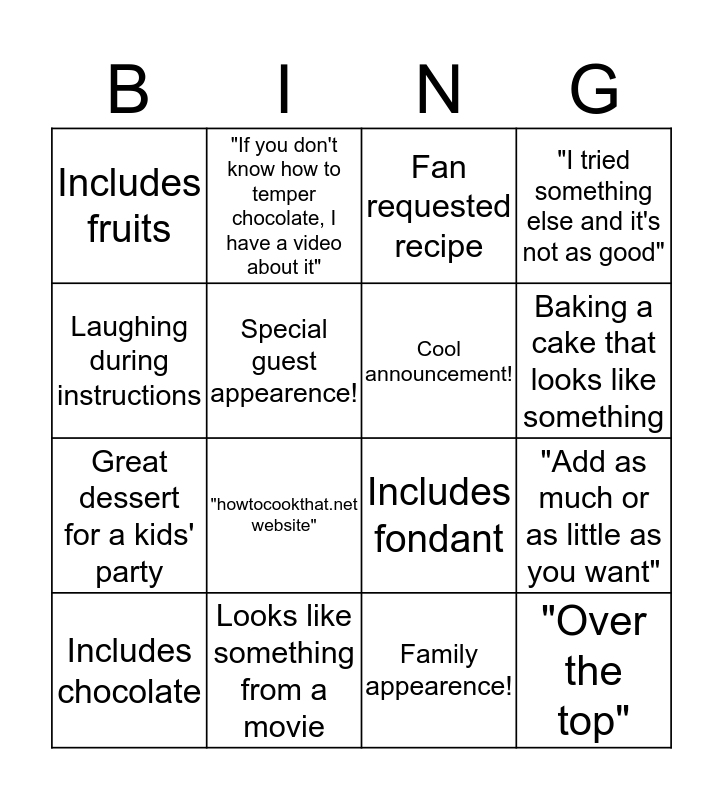 This bingo card has a free space and 15 words: Includes chocolate, "Over the top", Fan requested recipe, Includes fruits, Baking a cake that looks like something, Laughing during instructions, "howtocookthat.net website", Family appearence!, Special guest appearence!, Great dessert for a kids' party, "Add as much or as little as you want", "I tried something else and it's not as good", Cool announcement!, "If you don't know how to temper chocolate, I have a video about it" and Looks like something from a movie.