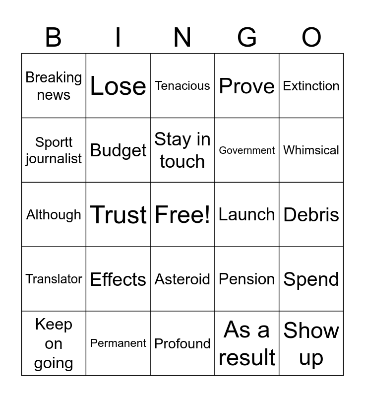 This bingo card has a free space and 66 words: Find out, Look into, Lose touch, Spend, Turn out, Go up, Lose, Miss, Stay in touch, Waste, Asteroid, Cordless vacuum, Debris, Extinction, Zero gravity, Sportt journalist, Trust, Breaking news, Figure out, Government, Effects, Translator, Prove, Headline, Dream big, Hungry for sucess, Fill out, Make up, Show up, Come back, Keep on going, Contract, Contribution, Donor, Pension, Permanent, Donation, Although, As a result, Identify, Budget, In addition, Launch, Logo, Such as, Whereas, Whimsical, Pivotal, Diligent, Reckless, Bountiful, Sublime, Frivolous, Tedious, Candid, Resilient, Exquisite, Impeccable, Tenacious, Profound, Mundane, Versatile, Nurture, Astute, Vibrant and Jubilant.