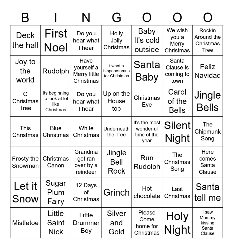 This bingo card has 56 words: Holy Night, Jingle Bells, All I want for Christmas is You, Deck the hall, Blue Christmas, 12 Days of Christmas, Rockin Around the Christmas Tree, Sleigh Ride, Rudolph, Grinch, Holly Jolly Christmas, Let it Snow, Frosty the Snowman, The Chipmunk Song, Little Saint Nick, Christmas Canon, Baby It's cold outside, Santa Baby, I saw Mommy kissing Santa Clause, Santa Clause is coming to town, Feliz Navidad, Grandma got ran over by a reindeer, Christmas Eve, Do you hear what I hear, Free!, Joy to the world, Silent Night, Winter Wonderland, Have yourself a Merry little Christmas, Jingle Bell Rock, Hark the herald angels sings, Here comes Santa Clause, Mistletoe, Little Drummer Boy, O Christmas Tree, We wish you a Merry Christmas, I want a hippopotamus for Christmas, Sugar Plum Fairy, Its beginning to look at lot like Christmas, First Noel, Up on the House top, Underneath the Tree, Hot chocolate, Marshmellow World, Santa tell me, Do you hear what I hear, This Christmas, Silver and Gold, The Christmas Song, It's the most wonderful time of the year, White Christmas, Run Rudolph, Last Christmas, Please Come home for Christmas, Carol of the Bells and All I want for Christmas is my two front teeth.