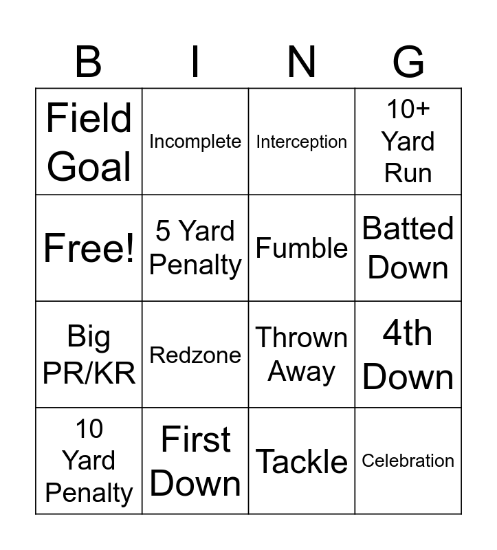 This bingo card has 16 words: First Down, 4th Down, Interception, Field Goal, Big PR/KR, Incomplete, Thrown Away, Tackle, Free!, 5 Yard Penalty, 10 Yard Penalty, 10+ Yard Run, Redzone, Batted Down, Fumble and Celebration.