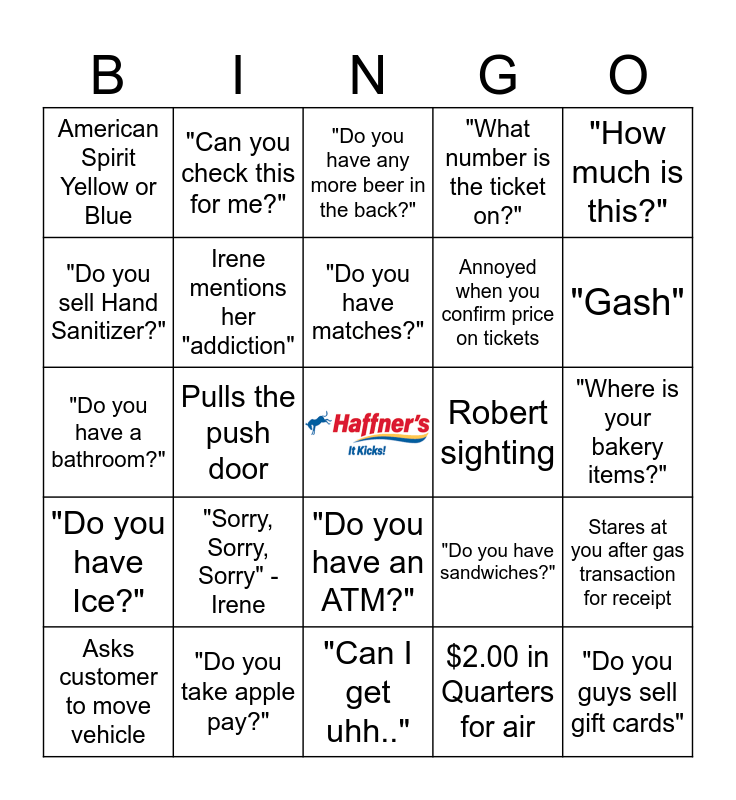 This bingo card has a free space and 43 words: "Marlboro in a box", "Do you guys sell gift cards", Gas pump goes off "FIGURE IT OUT!", Asks customer to move vehicle, "Do you have lighters?", $2.00 in Quarters for air, "Do you have any more beer in the back?", Hands big bill & can't break it, "How much is this?", "Do you take apple pay?", "What number is the ticket on?", Robert sighting, "Do you have an ATM?", "Sorry, Sorry, Sorry" -Irene, "where's your flavors?", "Can I get uhh..", Pulls on Ice Cream door after it closed, "Do you have a bathroom?", Person flattered by IDing, "Gash", "Can you check this for me?", Swipes EBT on reg card reader, Tim comes in more than 2 times during your shift, American Spirit Yellow or Blue, Person annoyed by IDing, "Where is your bakery items?", "Do you have Half & Half?", "What no coffee?", "Do you have sandwiches?", "Do you have Ice?", "Do you have a microwave", Stares at you after gas transaction for receipt, "Hold on I need one more thing", Pulls the push door, "Do you have cold wine?", "When do you close?", "Where are your draw slips?", "Do you have matches?", "Do you sell Hand Sanitizer?", Annoyed when you confirm price on tickets, Switches ticket after you tore it off, Irene mentions her "addiction" and Customer says they will reimburse you for a winner.