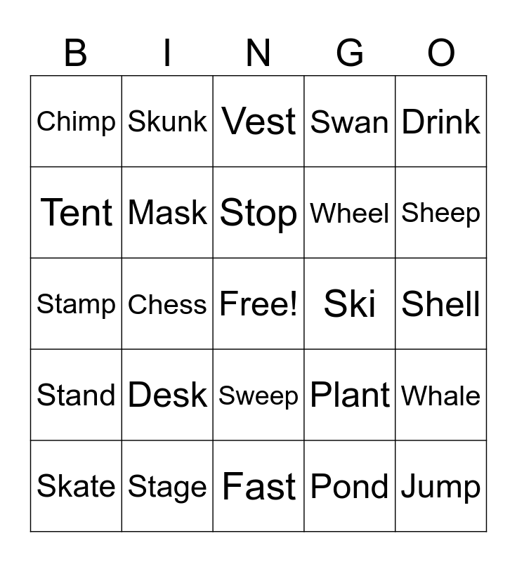 This bingo card has a free space and 24 words: Skate, Desk, Stop, Pond, Drink, Chimp, Skunk, Vest, Ski, Shell, Stamp, Mask, Plant, Whale, Tent, Stage, Fast, Swan, Sheep, Stand, Chess, Sweep, Wheel and Jump.