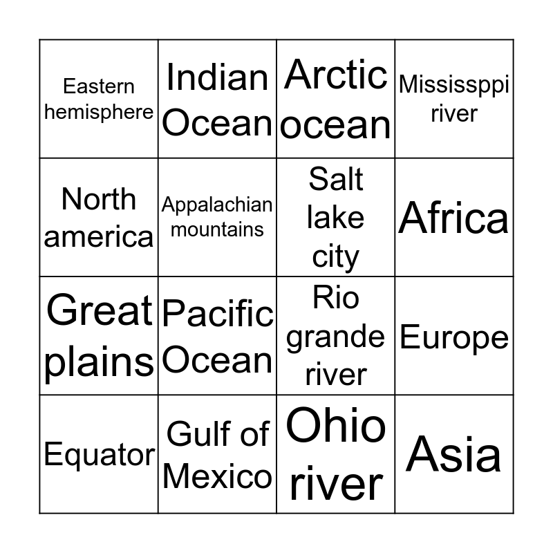This bingo card has a free space and 15 words: Equator, Asia, Arctic ocean, Eastern hemisphere, Africa, North america, Pacific Ocean, Ohio river, Appalachian mountains, Great plains, Europe, Mississppi river, Salt lake city, Indian Ocean and Gulf of Mexico.