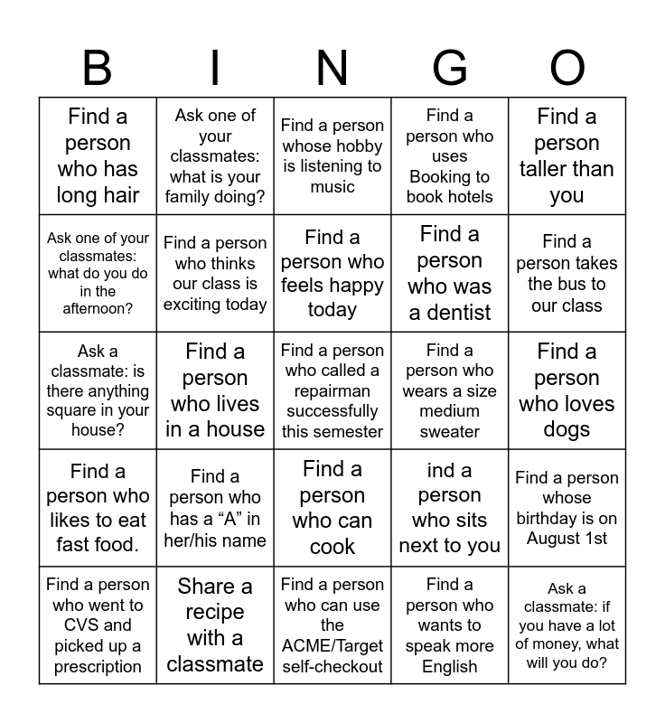 This bingo card has 25 words: Find a person who has a “A” in her/his name, Find a person who can use the ACME/Target self-checkout, Find a person who feels happy today, Find a person who went to CVS and picked up a prescription, Find a person taller than you, Find a person who has long hair, Ask one of your classmates: what do you do in the afternoon?, Ask one of your classmates: what is your family doing?, Find a person who wears a size medium sweater, Find a person who can cook, Find a person who was a dentist, Ask a classmate: is there anything square in your house?, ind a person who sits next to you, Find a person whose birthday is on August 1st, Find a person who thinks our class is exciting today, Ask a classmate: if you have a lot of money, what will you do?, Find a person who loves dogs, Find a person whose hobby is listening to music, Find a person takes the bus to our class, Find a person who lives in a house, Find a person who called a repairman successfully this semester, Share a recipe with a classmate, Find a person who likes to eat fast food., Find a person who uses Booking to book hotels and Find a person who wants to speak more English.