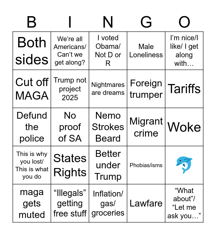 This bingo card has a free space and 30 words: “Illegals” getting free stuff, Pro-forced birth, No proof of SA, Do your research/ Let me research, Both sides, I voted Obama/ Not D or R, Trump not project 2025, Better under Trump, Migrant crime, Inflation/ gas/ groceries, Woke, “What about”/ “Let me ask you…”, Lawfare, Border, Tariffs, No new wars, Phobias/isms, This is why you lost/ This is what you do, States Rights, I’m nice/I like/ I get along with…, Defund the police, I’m just asking/ Not trying to argue, We’re all Americans/ Can’t we get along?, Foreign trumper, Cut off MAGA, Male Loneliness, 🐬, maga gets muted, Nightmares are dreams and We can all agree/ everybody knows.