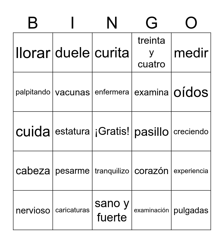 This bingo card has a free space and 39 words: cumpleaños, visitar, doctor, vacunas, nervioso, tranquilizo, enfermera, cuarto, medir, cabeza, estatura, treinta y cuatro, pulgadas, creciendo, pasillo, pesarme, báscula, llorar, escuchar, corazón, palpitando, sano y fuerte, examina, oídos, infección, vacuna, protegerme, enfermedades, infantiles, duele, acaricia, consuela, curita, caricaturas, examinación, recupero, experiencia, cuida and mundo.