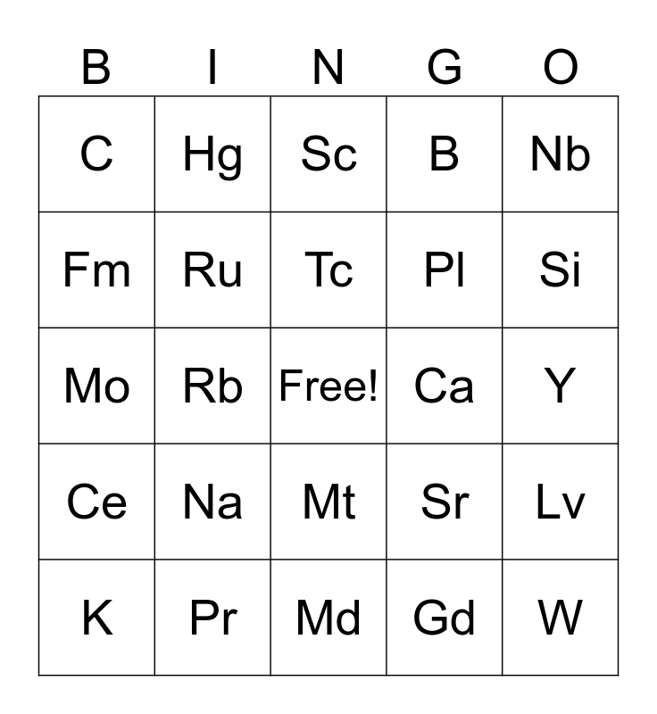 This bingo card has a free space and 80 words: Li, Be, Sc, Ti, V, Cr, Mn, Fe, Co, Ni, Cu, Zn, B, C, N, Fm, Te, Na, Mg, Y, Zr, Nb, Mo, Tc, Ru, Rh, Pd, Ag, Cd, Al, Si, P, Md, Po, K, Ca, La, Hf, Ta, W, Re, Os, Ir, Pt, Au, Hg, Ga, Ge, As, No, Lv, Rb, Sr, Ac, Rf, Db, Sg, Bh, Hs, Mt, Pl, Da, Cn, In, Sn, Sb, Lw, Uus, Cs, Ba, Ce, Pr, Nd, Pm, Sm, Eu, Gd, Tb, Dy and Ho.