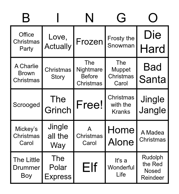 This bingo card has a free space and 24 words: The Little Drummer Boy, Jingle all the Way, The Nightmare Before Christmas, It's a Wonderful Life, Die Hard, Office Christmas Party, Love, Actually, Frozen, Christmas with the Kranks, Jingle Jangle, Scrooged, Christmas Story, Home Alone, A Madea Christmas, A Charlie Brown Christmas, The Polar Express, Elf, Frosty the Snowman, Bad Santa, Mickey’s Christmas Carol, The Grinch, A Christmas Carol, The Muppet Christmas Carol and Rudolph the Red Nosed Reindeer.