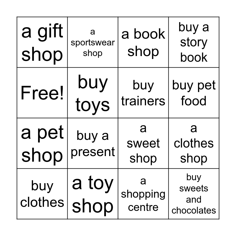 This bingo card has 16 words: a toy shop, a clothes shop, a book shop, a gift shop, a pet shop, a sportswear shop, a sweet shop, a shopping centre, Free!, buy toys, buy clothes, buy a story book, buy a present, buy pet food, buy trainers and buy sweets and chocolates.
