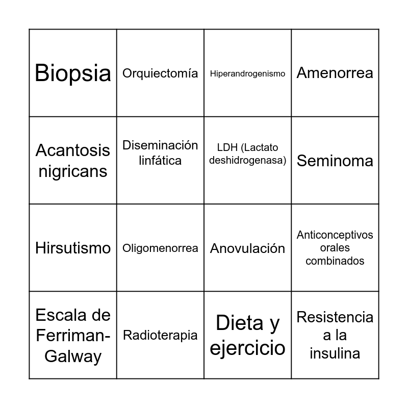 This bingo card has 22 words: Radioterapia, Quimioterapia, Orquiectomía, Tumor germinal, Diseminación linfática, LDH (Lactato deshidrogenasa), Biopsia, Hiperandrogenismo, Anovulación, Resistencia a la insulina, Hirsutismo, Amenorrea, Ultrasonido transvaginal, Metformina, Dieta y ejercicio, Criterios de Rotterdam, Anticonceptivos orales combinados, Escala de Ferriman-Galway, Oligomenorrea, Acantosis nigricans, Seminoma and Sindrome de Ovario Poliquistico.