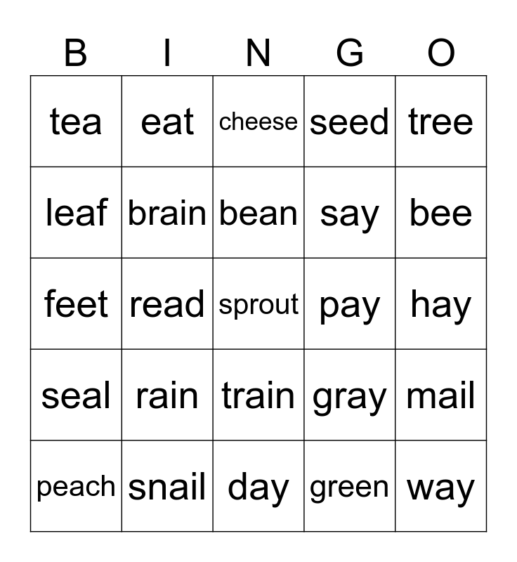 This bingo card has a free space and 24 words: rain, snail, bean, peach, tree, tea, leaf, eat, pay, train, say, feet, gray, mail, brain, green, hay, cheese, bee, read, way, seal, seed and day.