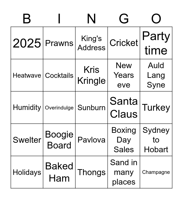This bingo card has 50 words: Free!, Sunburn, Bag of Ice, Thongs, Boogie Board, BBQ, Prawns, Xmas cake, Heatwave, Scorcher, Cocktails, Cricket, Sydney to Hobart, Boxing Day Sales, Headache, Trifle, Kris Kringle, Santa Claus, Aloe Vera, Party time, Overindulge, Sand in many places, 2025, New Years eve, Party Poppers, Champagne, Auld Lang Syne, Mariah Carey, King's Address, Pavlova, Cheese platter, Esky, Mince Pie, Rocky Road, Baked Ham, Advent Calendar, Candy Cane, Afternoon nap, Spritzer, Turkey, Cicadas, Sleigh ride, Santa sack, Picnic, Holidays, Humidity, Blisters, Summer solstice, Swelter and Daylight savings.