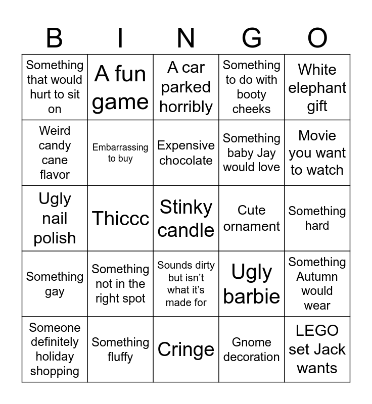 This bingo card has a free space and 24 words: Something not in the right spot, Something fluffy, Expensive chocolate, Someone definitely holiday shopping, White elephant gift, Something that would hurt to sit on, Weird candy cane flavor, A fun game, Cute ornament, Sounds dirty but isn’t what it’s made for, Something baby Jay would love, Ugly nail polish, Ugly barbie, Something Autumn would wear, Embarrassing to buy, Gnome decoration, Something hard, A car parked horribly, Movie you want to watch, Thiccc, LEGO set Jack wants, Something gay, Something to do with booty cheeks and Cringe.