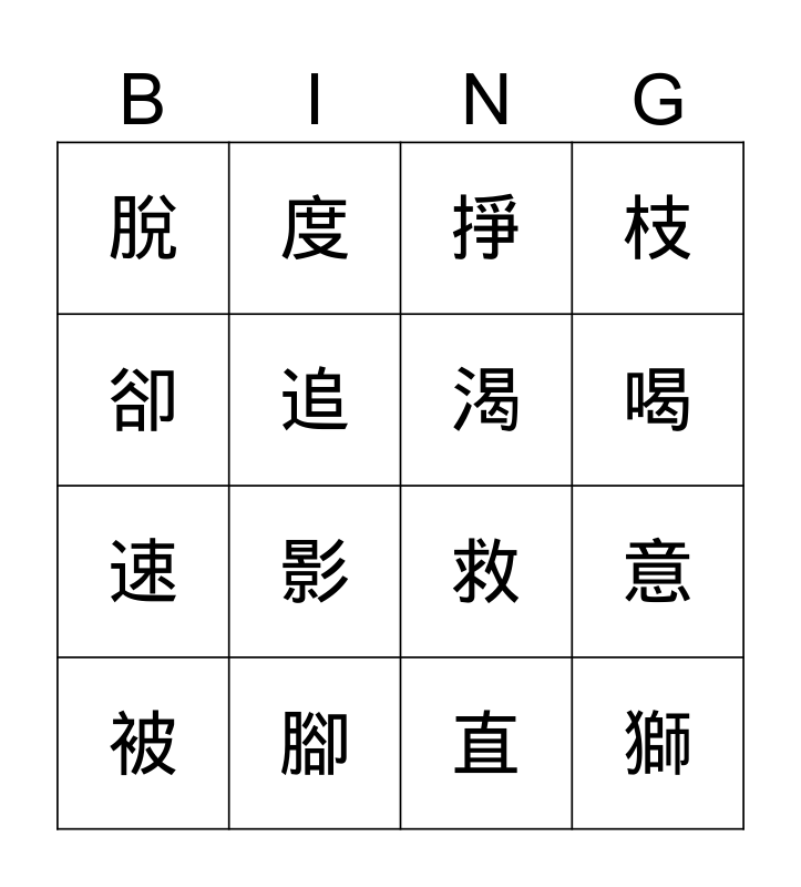 This bingo card has 16 words: 腳, 意, 掙, 脫, 速, 度, 救, 直, 卻, 追, 被, 枝, 影, 喝, 渴 and 獅.