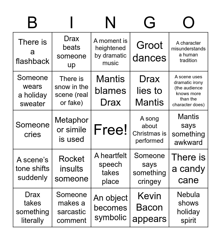 This bingo card has a free space and 29 words: Drax takes something literally, Rocket threatens to kill someone, Metaphor or simile is used, A character has an internal conflict (struggles with their thoughts or feelings), There is a flashback, A moment is heightened by dramatic music, There is snow in the scene (real or fake), Rocket insults someone, A song about Christmas is performed, Someone makes a sarcastic comment, Mantis says something awkward, Nebula shows holiday spirit, An object becomes symbolic, Kevin Bacon appears, A scene uses dramatic irony (the audience knows more than the character does), Someone acts suspiciously, A heartfelt speech takes place, A scene’s tone shifts suddenly, A character misunderstands a human tradition, Someone cries, Someone says something cringey, Groot says “Groot”, Drax lies to Mantis, Someone wears a holiday sweater, Groot dances, Drax beats someone up, There is a candy cane, Mantis blames Drax and A resolution solves a mis-understanding.